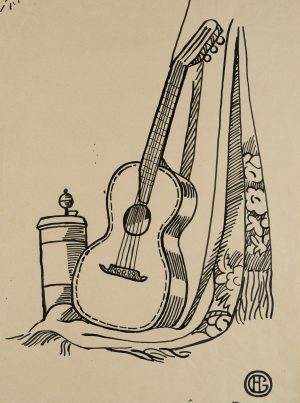 Monogramm HG (20.Jhd), Stillleben. Arrangement. Gitarre u. Teppich, Tusche